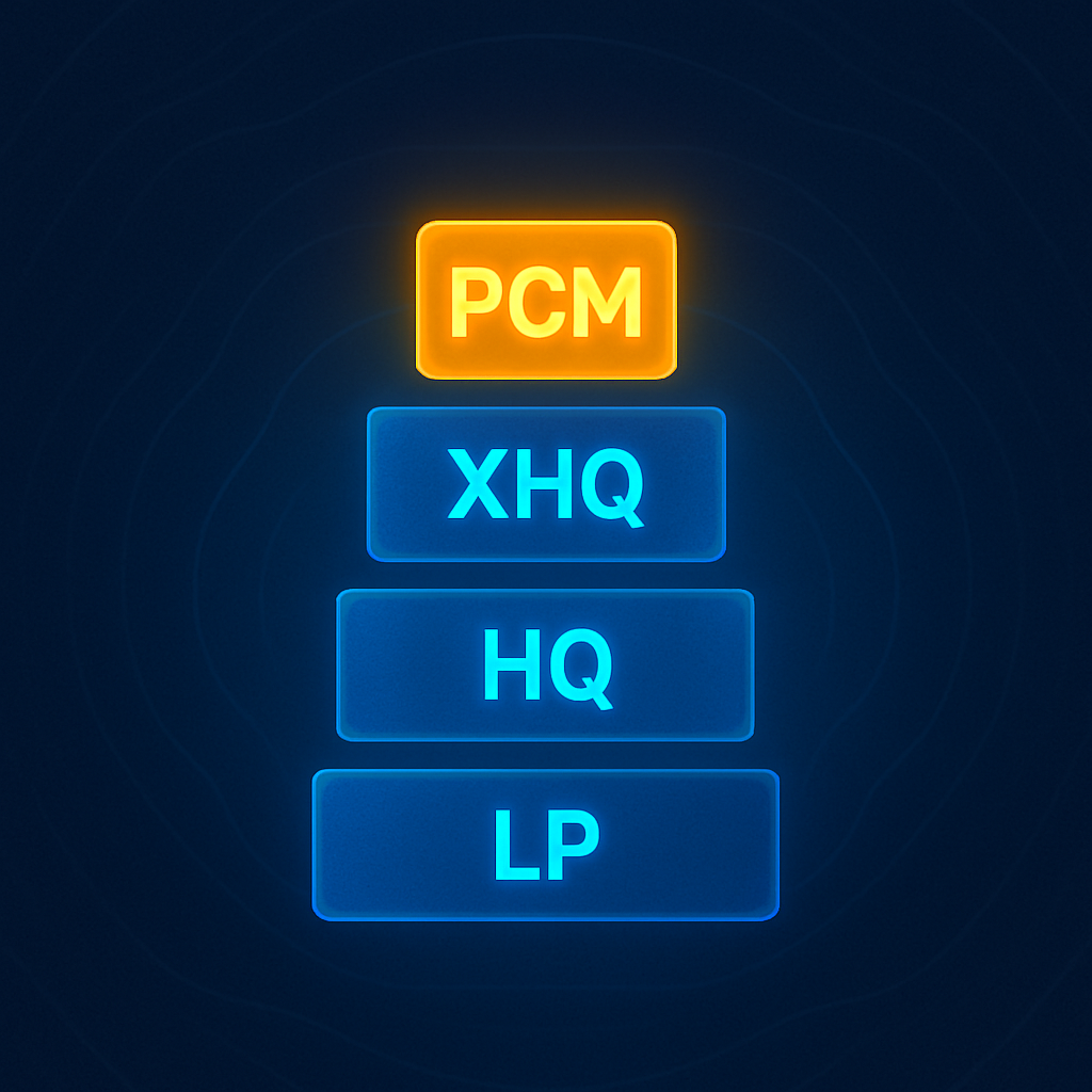 Choose PCM for broadcast-quality audio, XHQ for premium clarity, HQ for balanced performance, or LP for maximum storage. This flexibility lets you optimize for either audio fidelity or recording capacity based on your specific needs.